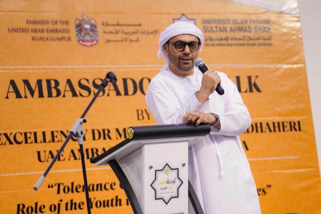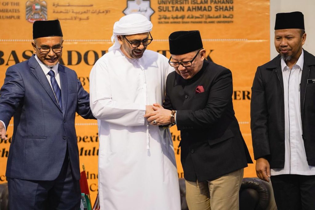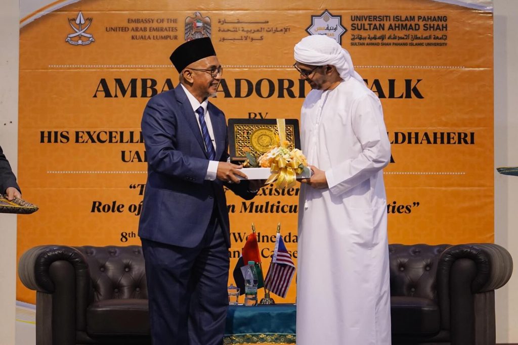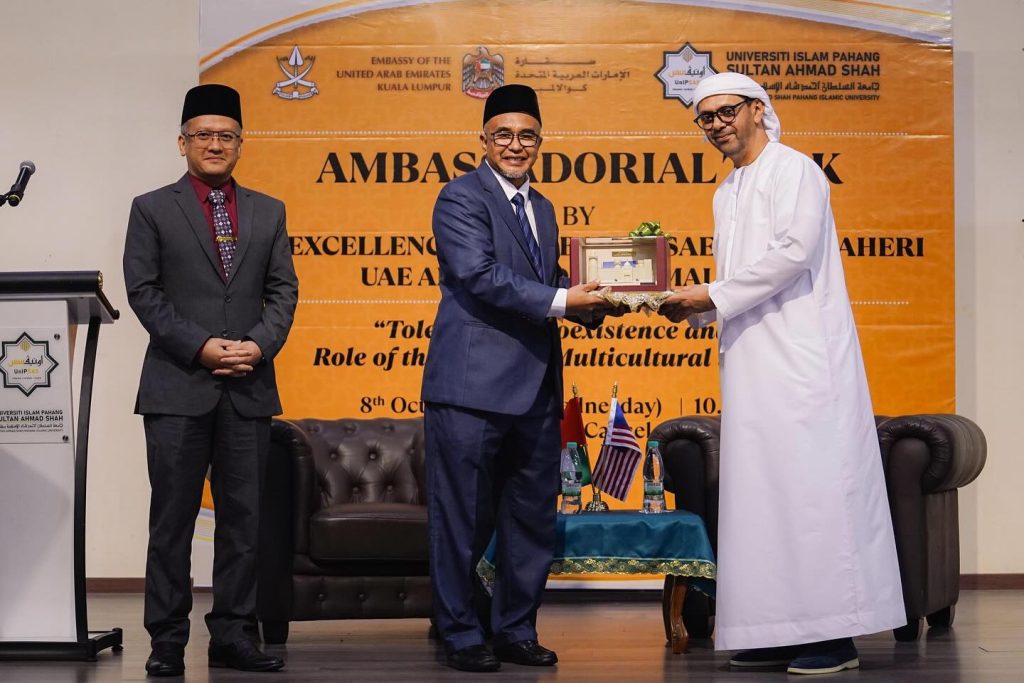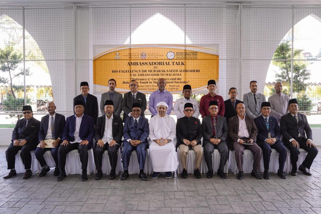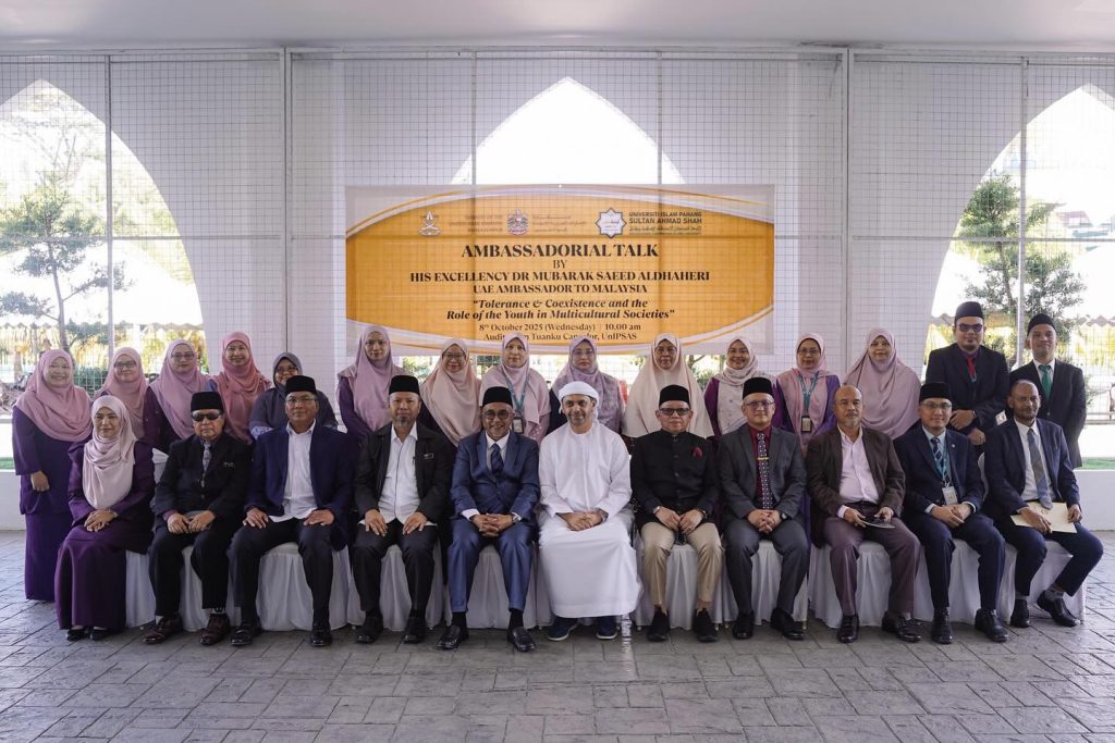 KUANTAN, 8 Oktober 2025 – Universiti Islam Pahang Sultan Ahmad Shah (UnIPSAS) menerima kunjungan rasmi Tuan Yang Terutama (TYT) Dr. Mubarak Saeed Aldhaheri, Duta Besar Emiriah Arab Bersatu (UAE) ke Malaysia, sempena Program Ambassadorial Talk bertajuk “Tolerance & Coexistence and the Role of the Youth in Multicultural Societies.”