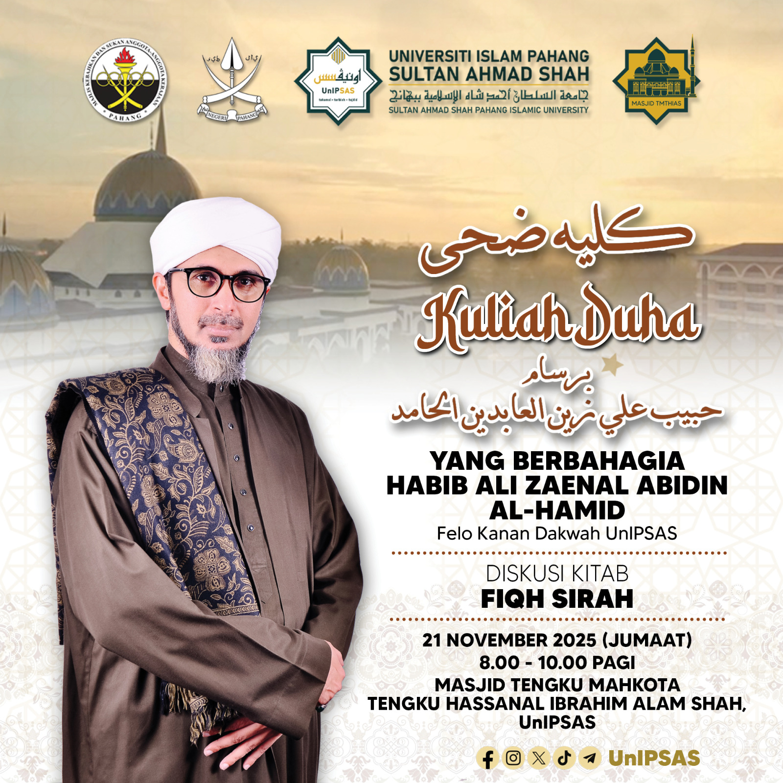Sukacita dimaklumkan Universiti Islam Pahang Sultan Ahmad Shah akan mengadakan Kuliah Duha Diskusi Kitab Fiqh Sirah bersama Yang Berbahagia Habib Ali Zaenal Abidin Bin Abu Bakar Al Hamid, Felo Kanan Dakwah UnIPSAS seperti ketetapan berikut:-